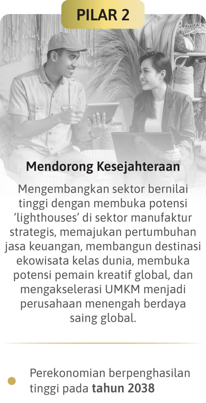 Untuk menjadi negara maju dan lepas dari jebakan negara kelas menengah, Peta Jalan ini merumuskan 4 pilar strategis untuk mencapai tujuan tersebut, antara lain: